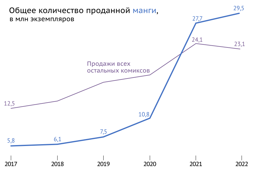 Теперь комиксы снова выходят вперёд, но не намного (51 против 49 процентов). При этом, если сравнить продажи с 2020 годом, то за прошлый год книг было продано в два раза больше.