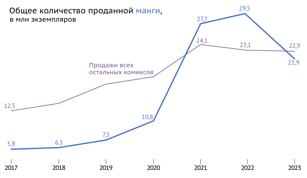 По новым данным «Circana BookScan» и анализа Брайана Хиббса, «пандемийный» бум манги подошёл к концу: суммарные продажи комиксов и манги в 2023 году (44,7 млн экз.) снизились на 15 % относительно предыдущего года. (Информация о методологии и данных за предыдущие годы — в прошлогодней записи).