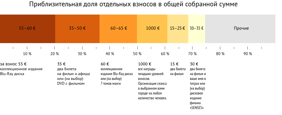 Сбор денег начался в середине июня, за два месяца до назначенной даты премьеры — 22 августа. Первый уровень закрывался на сумме в 15 тыс. евро и должен был покрыть следующие расходы: